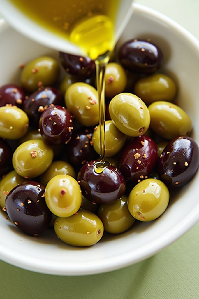 - If marinating, combine olives with a drizzle of olive oil, chopped fresh herbs, citrus zest, or chili flakes. Toss to combine.