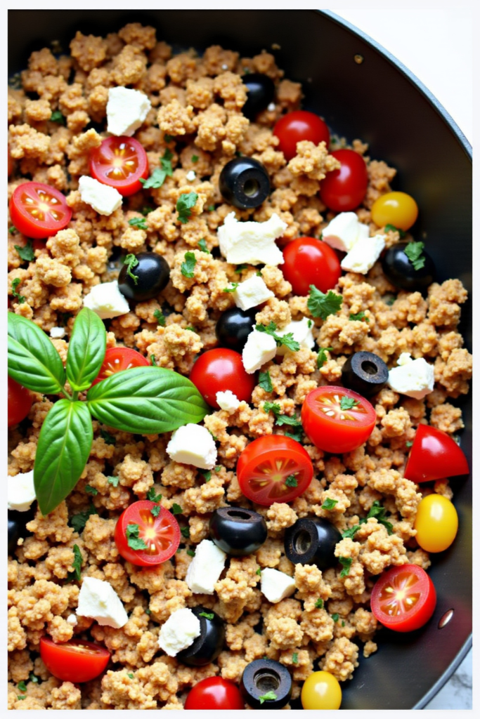 Mediterranean Keto Masterpiece: One-Pan Ground Chicken Skillet with Olives & Feta
