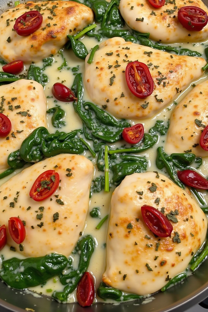 Creamy Tuscan Chicken stands out for its luscious, garlicky sauce enriched with tangy sun-dried tomatoes and tender spinach—all wrapped around juicy seared chicken breasts. The combination of bright tomatoes, earthy spinach, and rich cream transforms basic ingredients into a beautifully balanced, low-carb meal that’s deeply satisfying and bursting with Mediterranean flavor.