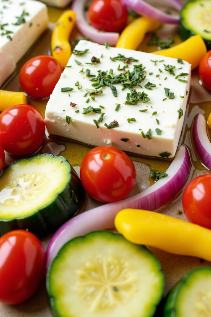 Once your veggies are prepped, arrange them in a single layer on a baking sheet or ovenproof dish. Place a block of feta in the center, drizzle everything with a bit more oil, and add an extra sprinkle of herbs and black pepper. Roast at a high temperature until the vegetables are caramelized and the feta is golden on the edges. Serve with crusty bread, over cooked grains, or as a side to grilled chicken or fish for a Mediterranean feast.
