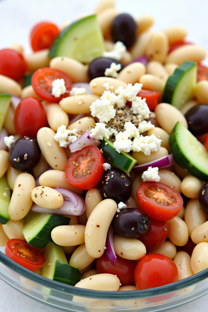 After prepping your ingredients, it’s all about layering: Start with the beans, add the chopped vegetables, then toss everything generously with dressing. Finish with crumbled feta, olives, and a sprinkle of fresh parsley or dill. The longer the salad sits, the more the flavors infuse—making it ideal for make-ahead meals or picnic fare.