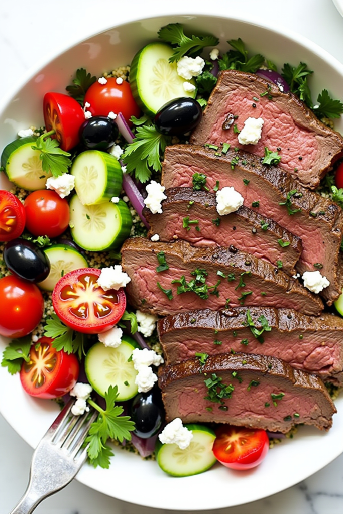 - Assemble the Bowls: Divide greens between two large bowls. Layer with tomatoes, cucumber, red onion, olives, and feta. Top with sliced steak.